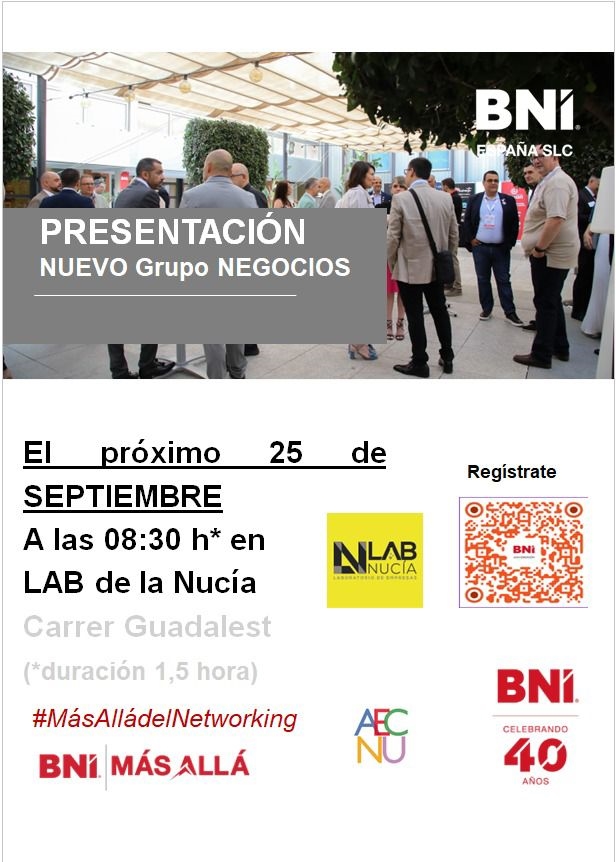 Este jueves 25 de septiembre a las 8,30 horas Lab_Nucia acoge el evento BNI Emoción, una jornada de networking con la finalidad de generar contactos y nuevas oportunidades de negocio para el empresariado. Las plazas son limitadas, la inscripción para esta formación es gratuita y se puede realizar en https://lab.lanucia.es/eventos/15927-Presentacion-Nuevo-Grupo-Negocios-BNI