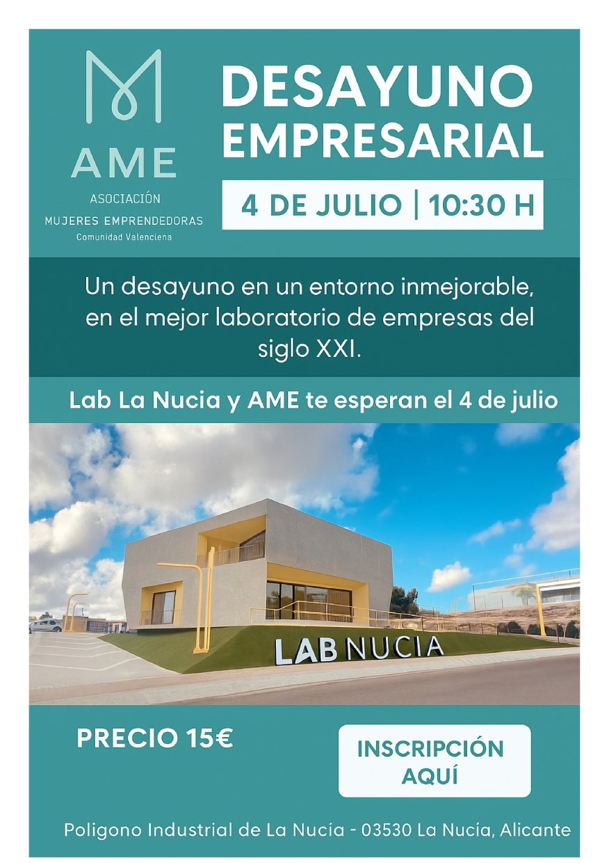 La Asociación de Mujeres Emprendedoras y Profesionales de la Comunidad Valenciana (AME) ha organizado un desayuno empresarial para mujeres emprendedoras y empresarias, el próximo viernes 4 de julio a las 10,30 horas en el Lab_Nucia. Todas las mujeres interesadas se pueden inscribir a través de AME, en el link https://buy.stripe.com/14AdRa3hcf8lgzxebccV20p