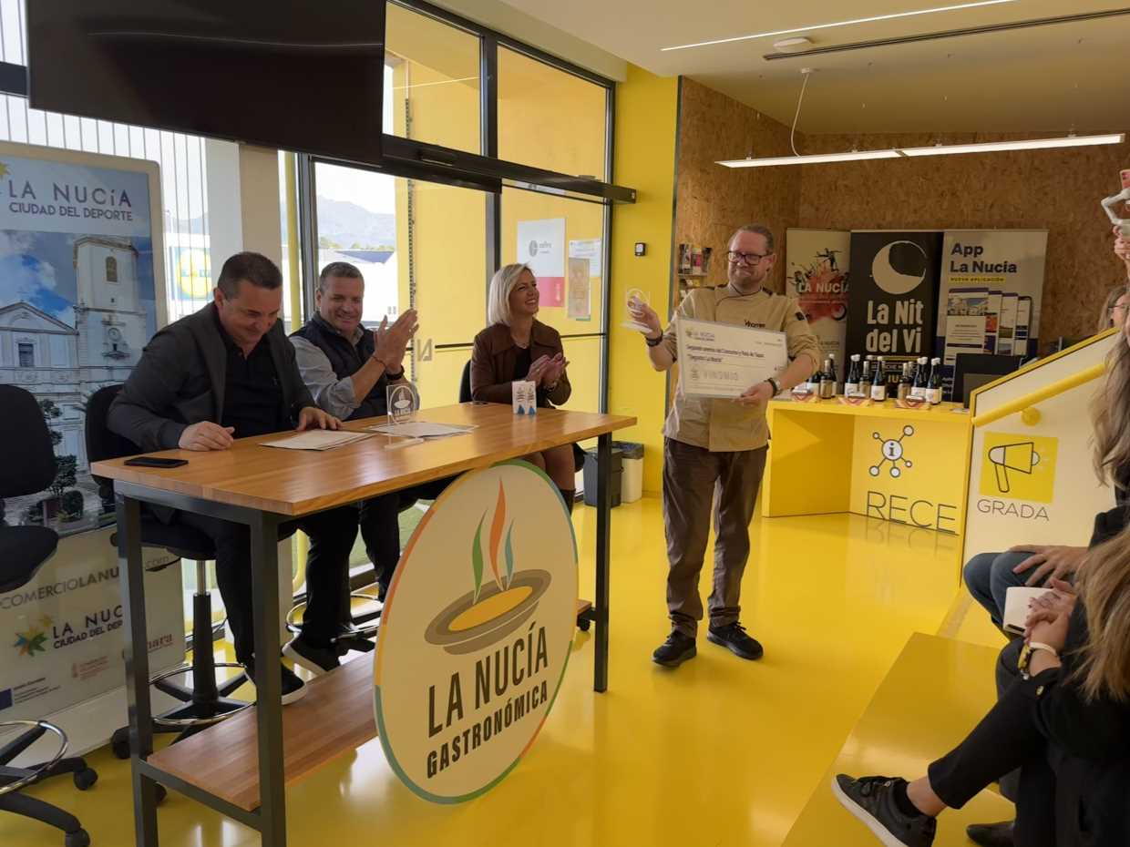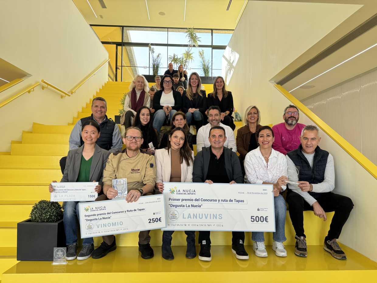 El objetivo de este certamen de tapas incluido en la programación anual de Lanuvins ha sido el ganador de la Ruta de Tapa “Degusta La Nucía” era impulsar y promocionar el sector restauración del empresariado nuciero. Esta mañana Francisco Juan, Director del CDT Benidorm, Bernabé Cano, alcalde de La Nucía y los concejales Mª Jesús Jumilla y Cristóbal Llorens han entregado los premios del I Concurso “Degusta La Nucía”, que se ha desarrollado del 1 al 15 de noviembre y en el que han participado 10 bares y restaurantes de La Nucía: Bearnés, Ca Vins amb Brases, Can Llucet, El Paraíso, Éter, La Plaça, Lanuvins, Plaça dels Músics, Ulía y Vinomio. Todos ellos han recibido un reconocimiento por su participación en el certamen.